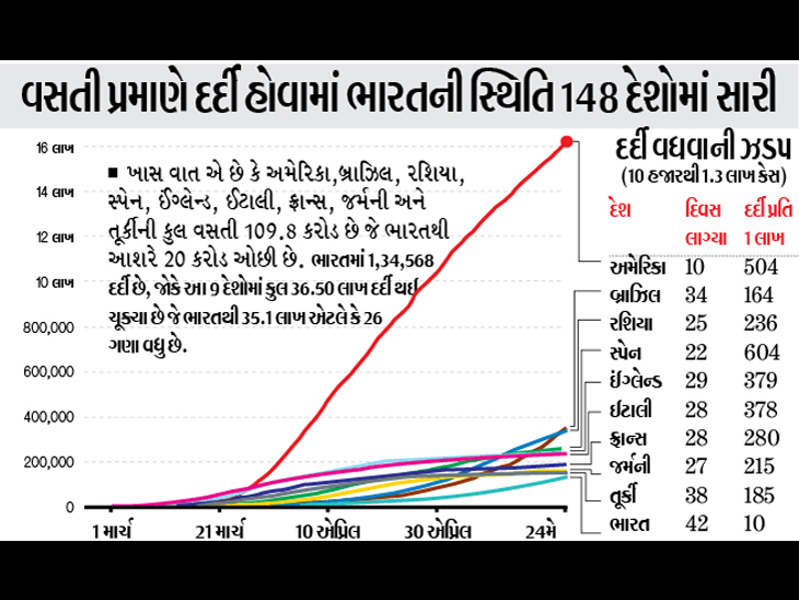 ભારતમાં મૃત્યુદર દુનિયાના 97 દેશોમાં ઓછો છે. અહીં દર 100 દર્દીમાંથી 3 મૃત્યુ પામી રહ્યા છે. વસતી પ્રમાણે જોવામાં આવે તો ભારતમાં દર 10 લાખમાંથી ફક્ત 3 લોકો મૃત્યુ પામ્યા છે. આ દૃષ્ટિએ ભારત 120માં ક્રમે છે. પણ ચિંતાની વાત એ છે કે 10 સૌથી ચેપગ્રસ્ત દેશોમાંથી બ્રાઝિલ અને ભારત જ એવા છે જ્યાં નવા દર્દી સતત વધી રહ્યા છે. બાકી 8 દેશોમાં હવે ઘટી રહ્યા છે.