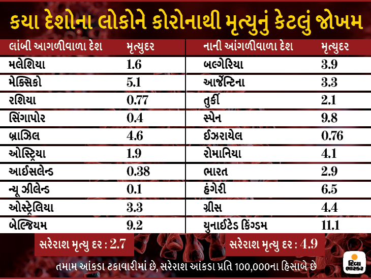 સંશોધકોએ જ્યારે એવા દેશોનું રિસર્ચ કર્યું જ્યાં મોટાભાગના પુરુષોની રિંગ ફિંગર નાની હોય છે. રિસર્ચમાં ખુલાસો થયો કે, આ દેશો કોરોનાથી થતાં સૌથી વધારે મૃત્યુના કેસમાં ટોપ 3માં સામેલ છે. કોરોનાથી થતાં મૃત્યુની સંખ્યા અન્ય દેશોની તુલનામાં 30% વધારે હોવાનું જાણવા મળ્યું છે.