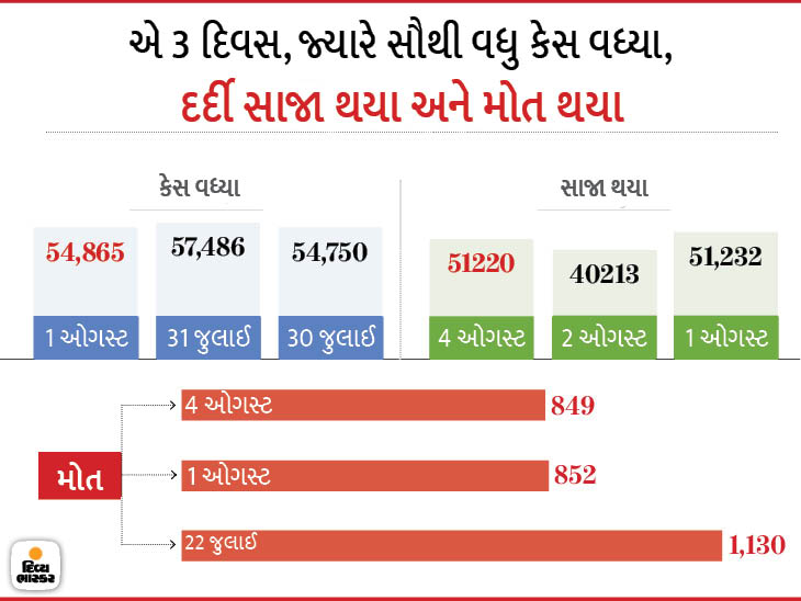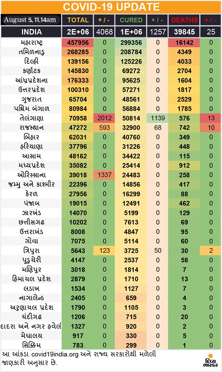 દેશમાં કોરોના દર્દીઓનો આંકડો 19 લાખ પાર થઈ ગયો છે. અત્યાર સુધીમાં 19 લાખ 6 હજાર 616 લોકો સંક્રમિત થયા છે. છેલ્લા 24 કલાકમાં 51 હજાર 282 નવા દર્દીઓ વધ્યા છે. જ્યારે 51 હજાર 220 દર્દી સાજા થયા છે. આ આંકડા covid19india.org પ્રમાણે છે.