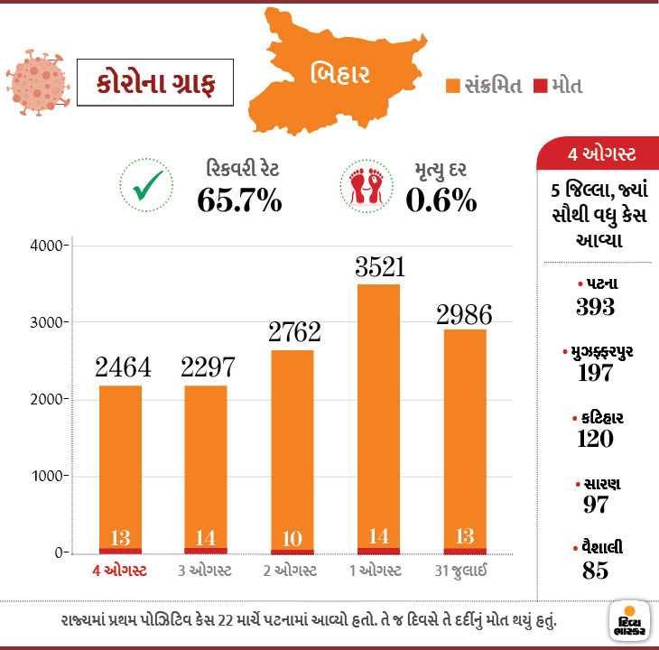 બિહાર: રાજ્યમાં છેલ્લા 24 કલાકમાં રેકોર્ડ 38 હજાર 215 સેમ્પલની તપાસ કરવામાં આવી છે. સોમવારની સરખામણીએ મંગળવારે રાજ્યનો રિકવરી રેટ 64%થી વધીને 65.71% થયો છે. સ્વાસ્થ્ય વિભાગના પ્રધાન સચિવ પ્રત્યય અમૃતે બધી મેડિકલ કોલેજ હોસ્પિટલોના પ્રિન્સિપલ અને સુપરટેંડેન્ટ સાથે વીડિયો કોન્ફરન્સિંગ કરી હતી. તેમણે બધી કોવિડ-19 હોસ્પિટલમાં દરરોજ હેલ્થ બુલેટિન જારી કરવા કહ્યું છે.