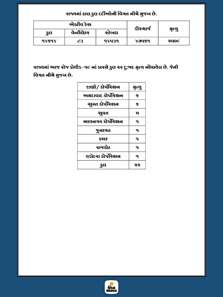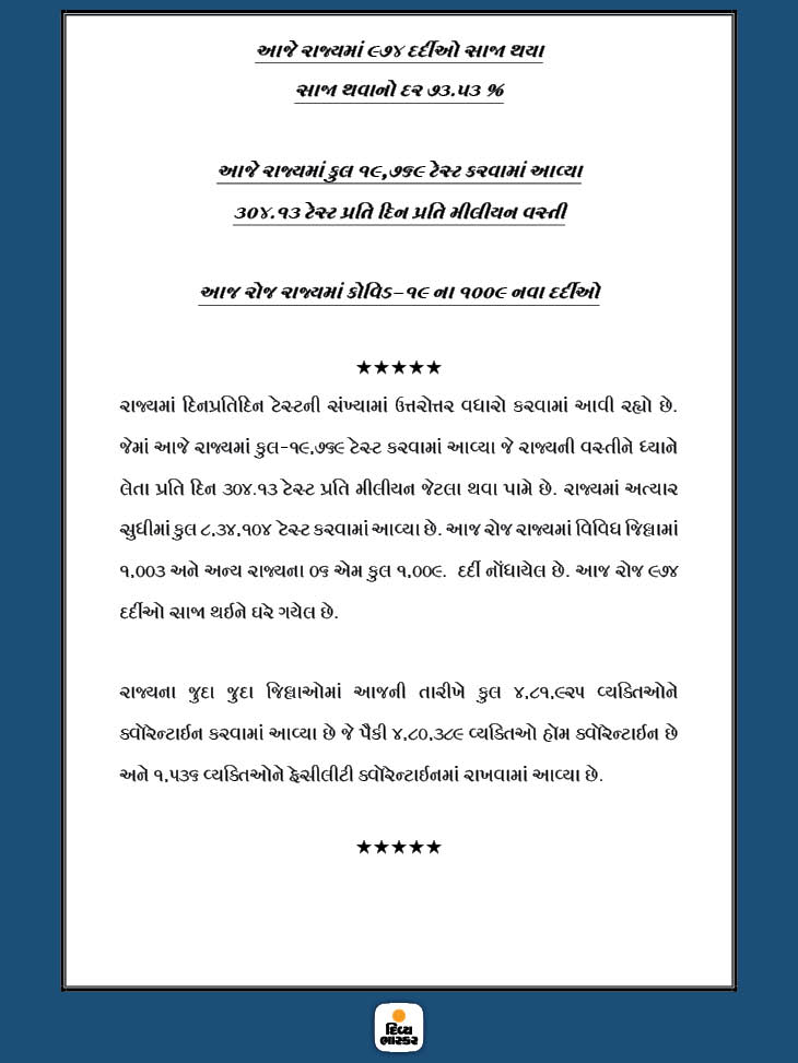 રાજ્યમાં કોરોના મહામારી થયાવત્ છે. દરરોજ 1000થી વધુ કેસ તેમજ 20થી વધુના મોત થયા છે. આ સાથે રાજ્યમાં અત્યાર સુધીમાં કુલ 64,684 કેસ પોઝિટિવ નોંધાયા છે. જેમાથી 47,561 દર્દી ડિસ્ચાર્જ અને 2,509ના મોત નિપજ્યાં છે. ગઈકાલે છેલ્લા 24 કલાકમાં નવા 1009 કેસ નોંધાયા છે, જ્યારે 22 દર્દીના મૃત્યુ થયા છે. તો બીજી તરફ 974 દર્દી સાજા થઇને ઘરે પરત ફર્યા છે. ગુજરાતમાં અત્યાર સુધીમાં કુલ 8,34,104 ટેસ્ટ થયા છે. જ્યારે હાલ 14614 એક્ટિવ કેસ છે, જેમાંથી 83 વેન્ટિલેટર પર અને 14531 દર્દીની હાલત સ્થિર છે.