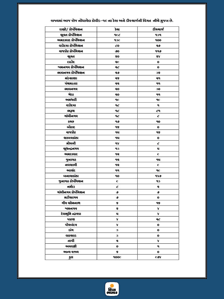 30 મેથી 2 ઓગસ્ટ સુધી રાજ્યમાં નોંધાયેલા કેસ, મોત અને ડિસ્ચાર્જનો આંકડો
