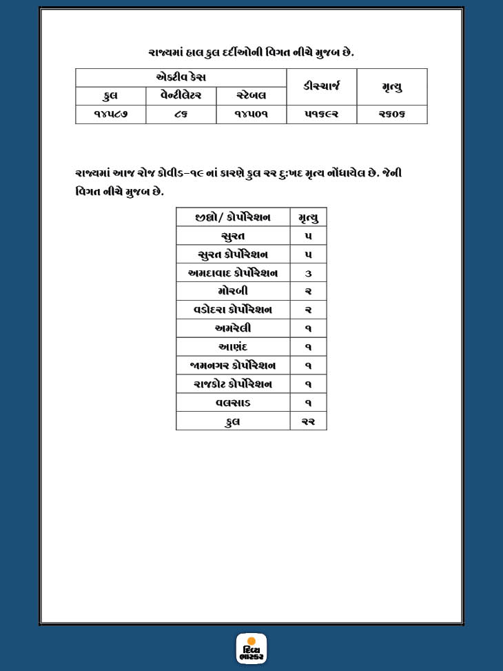 રાજ્યમાં હજુ પણ કોરોનાના કેસ ઓછા થવાનું નામ નથી લઈ રહ્યા છે. દરરોજ 1000થી વધુ નવા કેસ સામે આવી રહ્યા છે. જ્યારે 20થી વધુ દર્દીના મોત થાય છે. આ સાથે રાજ્યમાં અત્યારસુધીમાં કુલ 9,30,373 ટેસ્ટમાંથી 68,885 કેસ પોઝિટિવ નોંધાયા છે અને મૃત્યુઆંક 2606 થયો છે. તો બીજી તરફ 51,692 દર્દી સાજા થઇને ઘરે પરત ફર્યા છે. હાલ 14,587 એક્ટિવ કેસ છે, જેમાંથી 86 વૅન્ટિલેટર પર અને 14,501ની હાલત સ્થિર છે. ગઈકાલે છેલ્લા 24 કલાકમાં નવા 074 નવા કેસ સામે આવ્યા છે અને 22 દર્દીના મૃત્યુ થયા છે, જ્યારે 1,370 દર્દીને ડિસ્ચાર્જ કરવામાં આવ્યા છે.