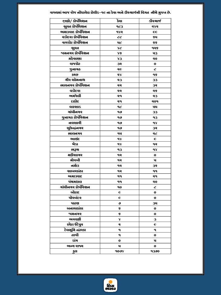 30 મેથી 7 ઓગસ્ટ સુધી રાજ્યમાં નોંધાયેલા કેસ, મોત અને ડિસ્ચાર્જનો આંકડો